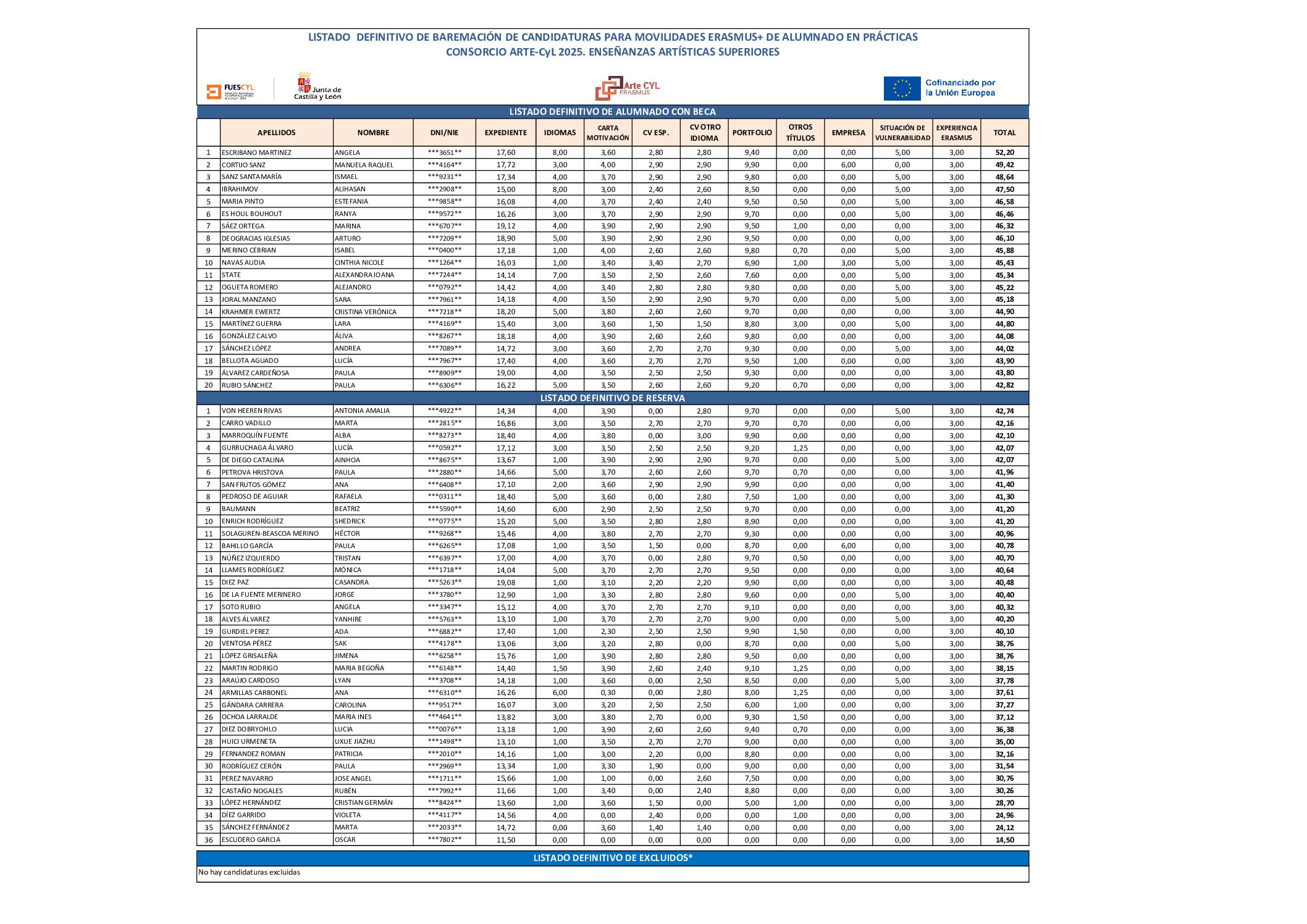 Listado definitivo de baremación de ALUMNOS – movilidad prácticas Erasmus+ ARTE CYL (Superiores)